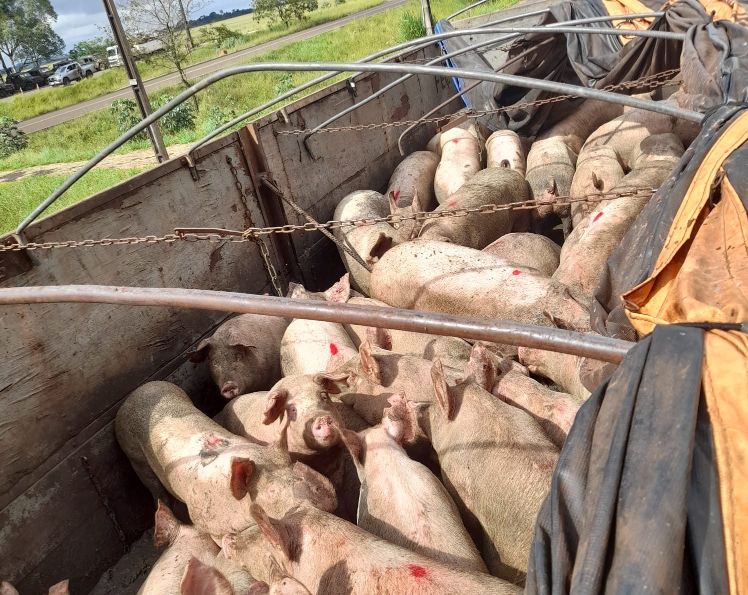 Também aplicou-se multa a veículo que transportava suínos vivos em veículo impróprio. Segundo as informações levantadas, ainda que os animais sejam encaminhados a frigoríficos para abate, o transporte e outras providências devem ser humanizadas e em acordo com a lei e a Portaria do IAGRO.