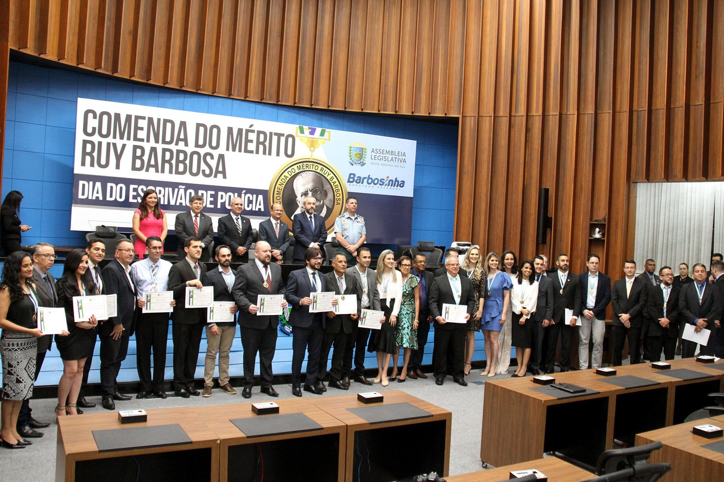 Campo Grande (MS) – Escrivães da Polícia Civil de Mato Grosso do Sul foram homenageados pela Assembleia Legislativa de Mato Grosso do Sul na noite desta quinta-feira (7), com a Comenda do Mérito Ruy Barbosa. A sessão solene de outorga realizada no