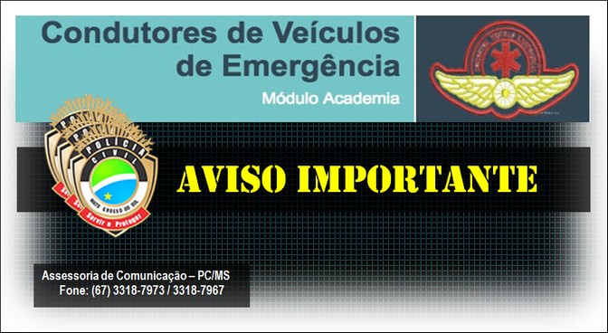 CAMPO GRANDE (MS) – A Polícia Civil, por meio da Academia de Policia Civil (ACADEPOL), informa aos policiais civis matriculados no Curso de Condutores de Veículos de Emergência que as aulas ocorrerão no período de 04/03/2018 a