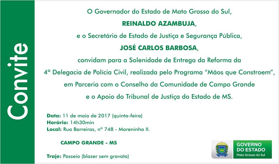 CAMPO GRANDE (MS): O governador do Estado do Mato Grosso do Sul, Reinaldo Azambuja, e o Secretário de Estado de Justiça e Segurança Pública – José Carlos Barbosa, convidam para a Solenidade de Entrega da Reforma da 4ª Delegacia de polícia Civil,