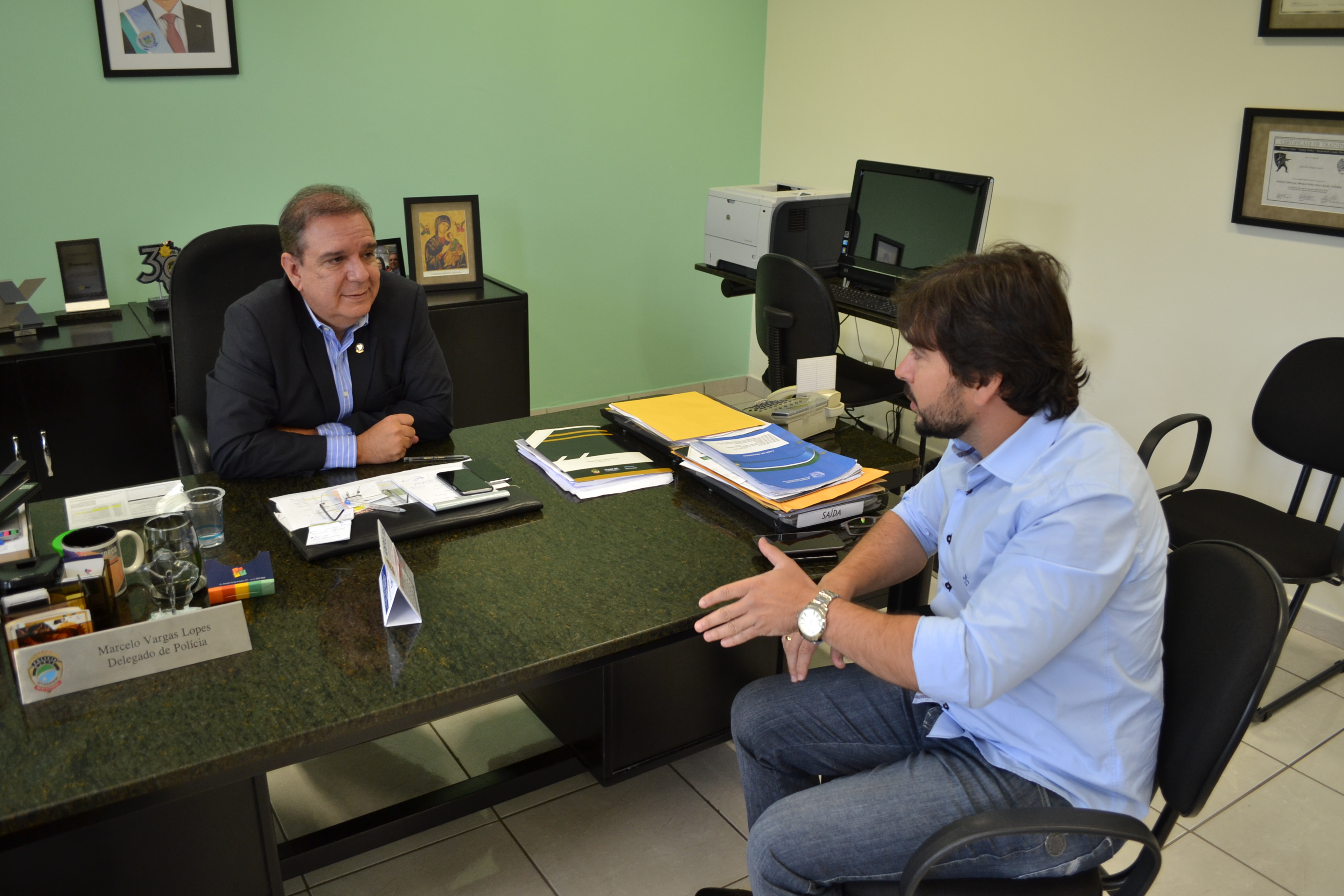 CAMPO GRANDE (MS): O Delegado Geral da Polícia Civil do Mato Grosso do Sul – Dr. Marcelo Vargas Lopes recebeu, nesta terça-feira (18), o presidente do SINPOL-MS (Sindicato dos Policiais Civis do Mato Grosso do Sul) – Giancarlo Miranda, em visita