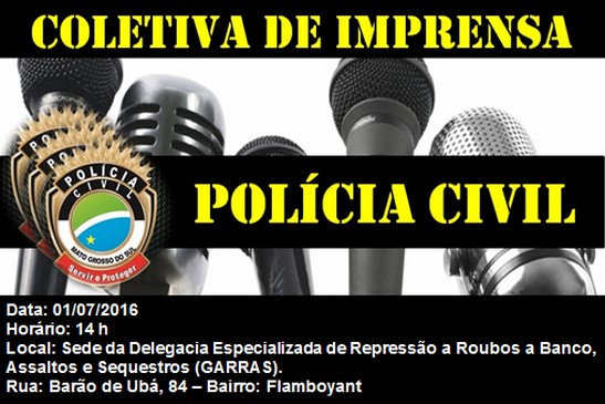 CAMPO GRANDE (MS): Amanhã, (01/07), às 14h, na Sede da Delegacia Especializada de Repressão a Roubos a Banco, Assaltos e Sequestros (GARRAS), a Polícia Civil apresentará 04 envolvidos no roubo a uma agência bancária do Banco do Brasil, ocorrido no