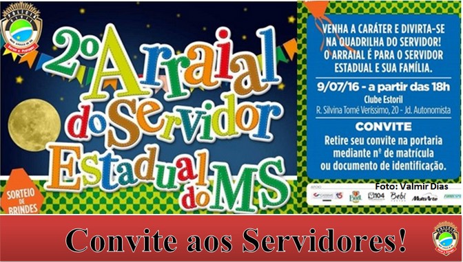 CAMPO GRANDE (MS): O Governo do Estado de Mato Grosso do Sul convida todos os servidores e suas famílias para o “2º ARRAIAL DO SERVIDOR ESTADUAL DO MS” que acontecerá no próximo dia 09 de Julho, à partir das 18h no Clube Estoril, localizado na Rua