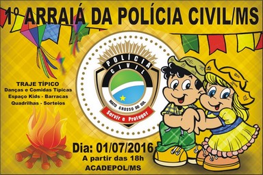CAMPO GRANDE (MS): A Polícia Civil do Estado de Mato Grosso do Sul, realizará, no dia 01 de julho 2016, a partir das 18:00 horas, nas dependências da Academia de Polícia Civil Delegado Júlio Cesar da Fonte Nogueira (ACADEPOL), o “1º Arraiá