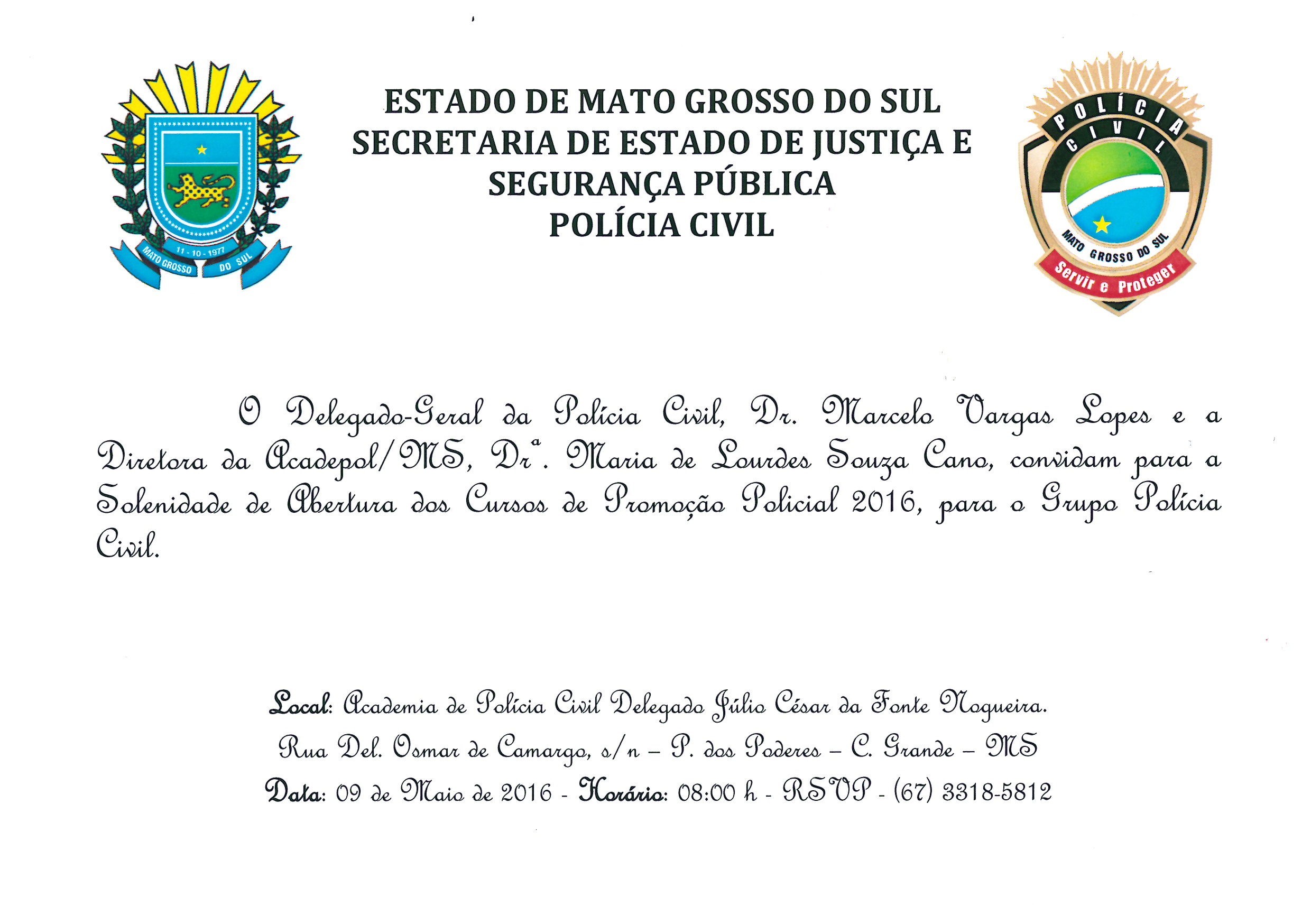 CAMPO GRANDE (MS): No próximo dia 09 de maio (segunda-feira), às 8h, no auditório da Academia da Polícia Civil Júlio Cesar da Fonte Nogueira (Acadepol) haverá a solenidade de abertura do ciclo de cursos para promoção funcional do grupo Polícia Civil.