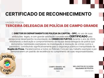 Na última quinta-feira (22), o Diretor do Departamento de Polícia da Capital, Dr. Wellington de Oliveira, agraciou a equipe da 3ª Delegacia de Polícia com uma comenda em razão do excepcional desempenho na elucidação dos crimes de furto na região do