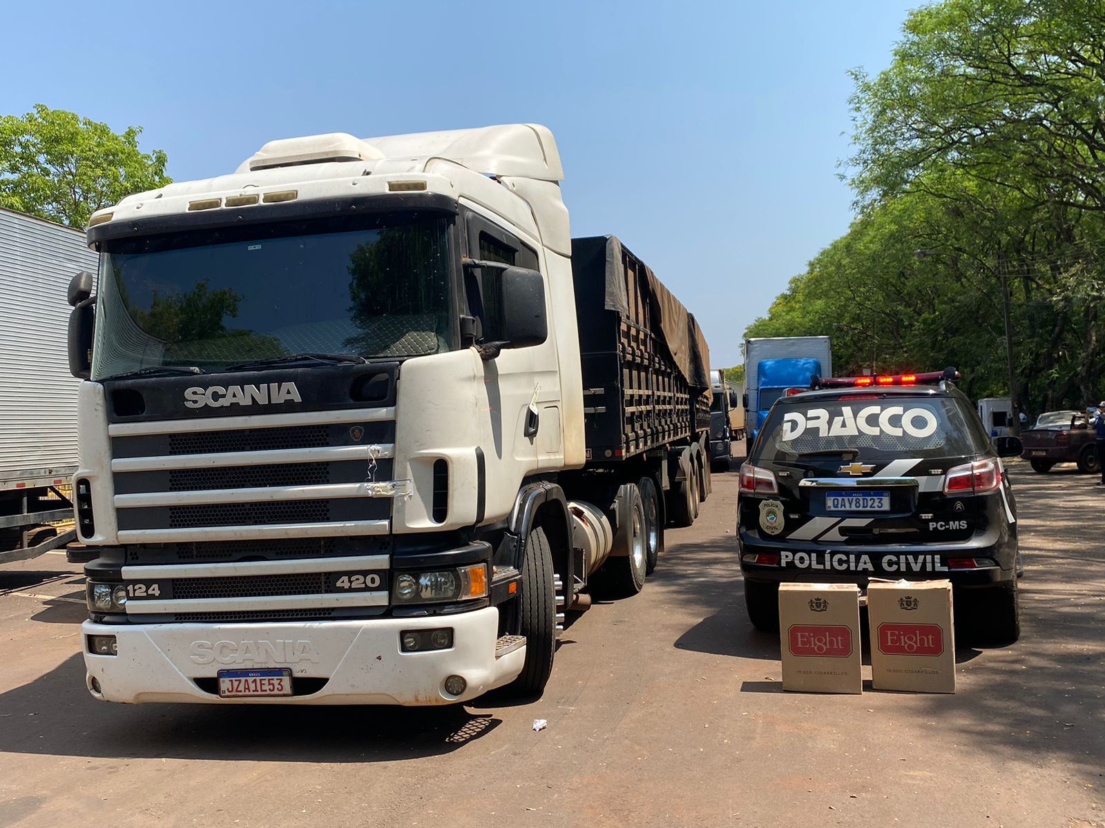 Quando os policiais procederam a abordagem, em Cafezal do Sul-PR, de um veículo SCANIA/R-124 GA 420 6X4 NEZ, de cor branca, com semirreboque (bitrem) acoplado foi constatado que, ao invés de transportar 36.000kg de milho em grãos, o veículo estava carregado com 800 caixas de cigarro contrabandeados do Paraguai, da marca EIGHT. Diante dos fatos, o autor foi preso em flagrante e encaminhado para a Delegacia da Polícia Federal de Guaíra para as providências necessárias.