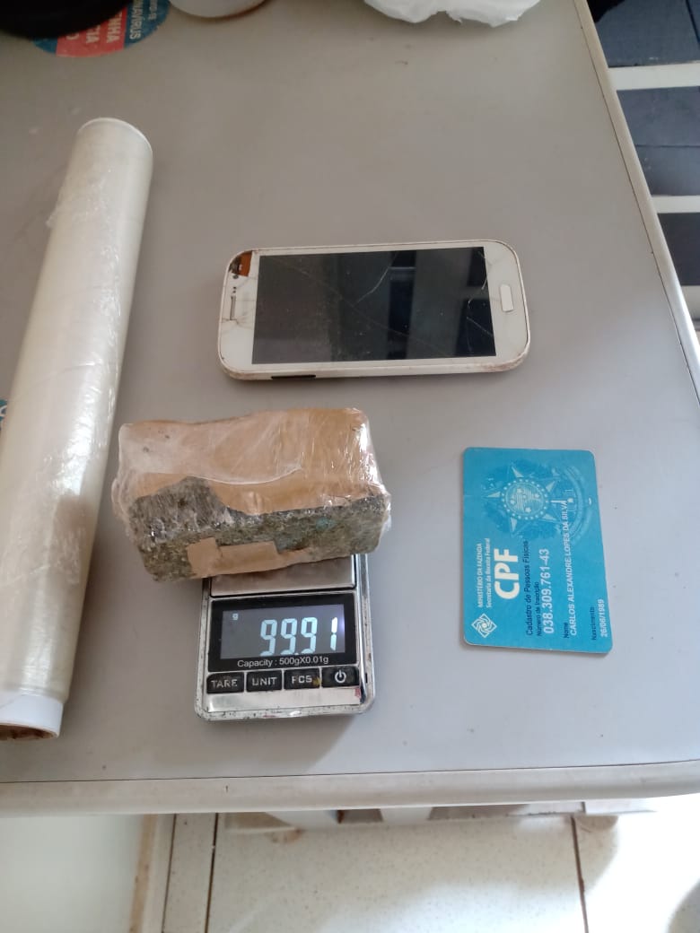 Na casa de C. A. L. S., de 32 anos, os policiais, com apoio do Canil de Coxim/MS, conseguiram apreender 1 tijolo de maconha, com peso aproximado de 100,00 gramas, bem como 1 rolo de papel filme.