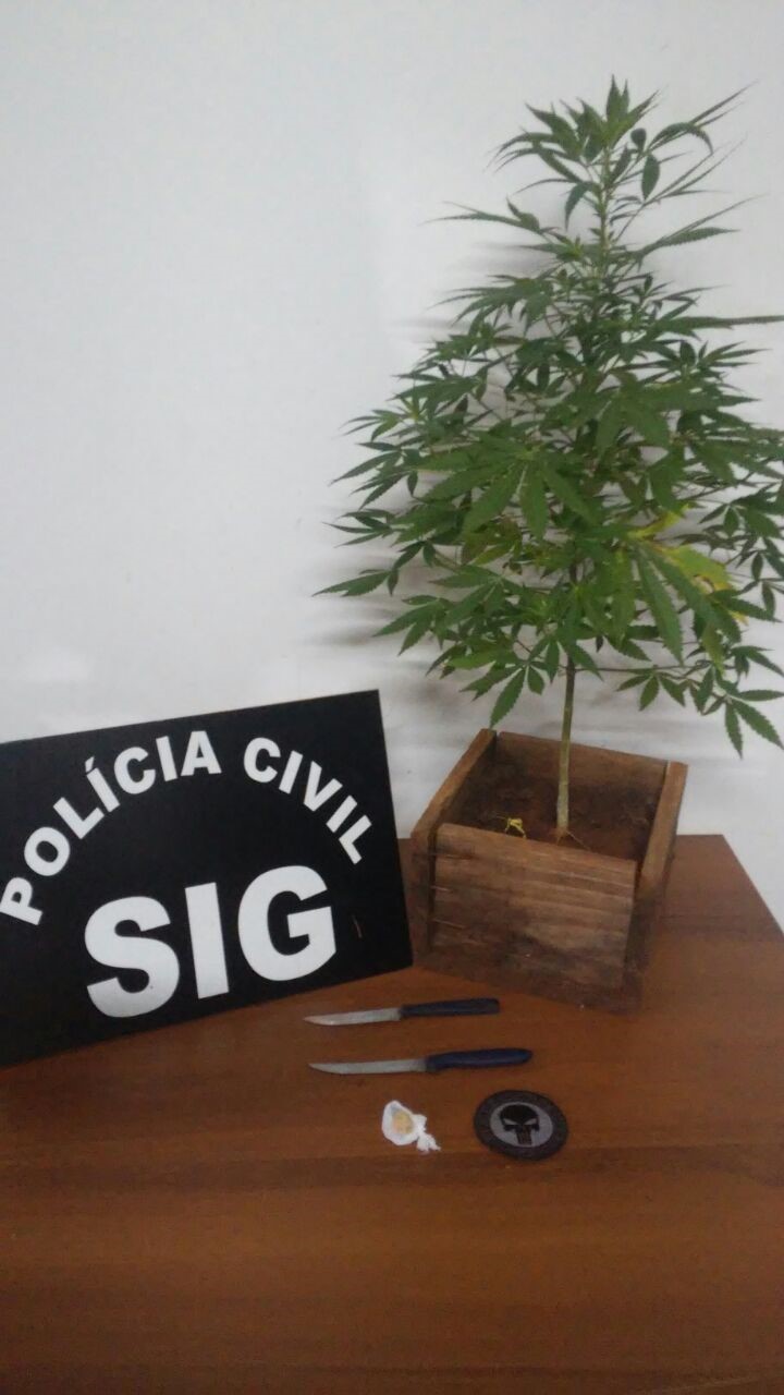 Durante as diligências, os investigadores avistaram um pé de maconha no quintal de sua residência, com aproximadamente 83 cm. Questionado sobre a origem do pé de maconha, ele informou que era de sua propriedade e informou ainda que haveria mais drogas na residência, sendo encontrada posteriormente uma pedra bruta de crack com 0,4 gramas escondida em seu guarda roupa.
