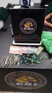Após o fato uma equipe realizou a abordagem dos envolvidos, dois adolescentes de 15 anos, e em revistas ao local onde o adolescente abaixou foi encontrado no meio da mata uma camiseta com várias porções de substância análoga a maconha e várias porções de substâncias análoga a cocaína, além de dinheiro.