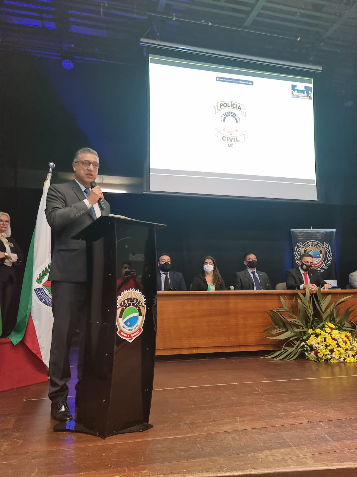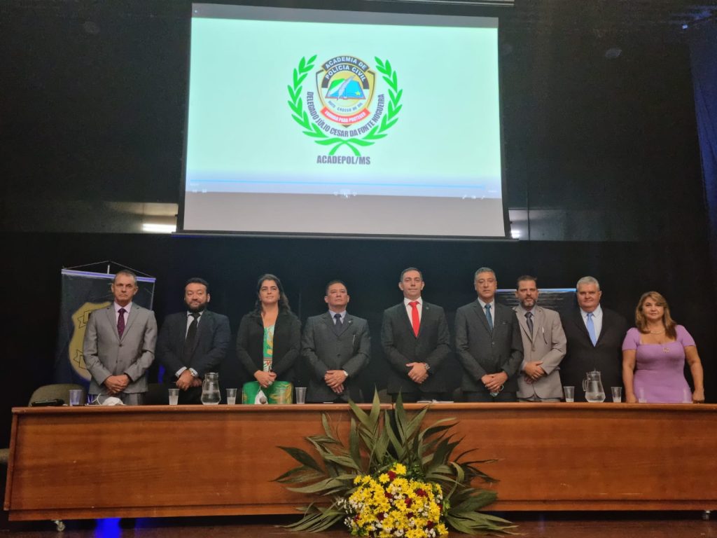 O Delegado Geral agradeceu ainda ao governo do Estado, nas pessoas do governador Reinaldo Azambuja, do secretário de Infraestrutura Eduardo Ridel e do secretário de Justiça e Segurança Pública Antônio Carlos Videira que permitiram a ampliação no número de vagas destinadas ao concurso. “Nós tínhamos uma previsão de 55 vagas de agentes de polícia científica para a Academia e hoje somos mais de cem e isso se deve ao pensamento de Estado dessas três pessoas anteriormente citadas. A vida de cada um de vocês que, no dia de hoje realizam um sonho, passa pela decisão dessas três pessoas. Portanto que possamos fazer jus ao investimento, não financeiro, mas ao investimento na vida de cada um dos senhores que deixem de ser pessoas comuns e passam a ser policiais.”, finalizou.