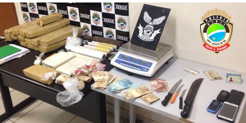 No imóvel foram localizados quatro aparelhos de celular, R$ 16.200,00 (dezesseis mil e duzentos reais), um caderno de contabilidade com anotações, duas balanças, seis rolos de papel filme, quatro facas com resquícios de droga, diversos tabletes pesando 16,300 quilos de maconha, além de 3,572 quilos de cocaína.