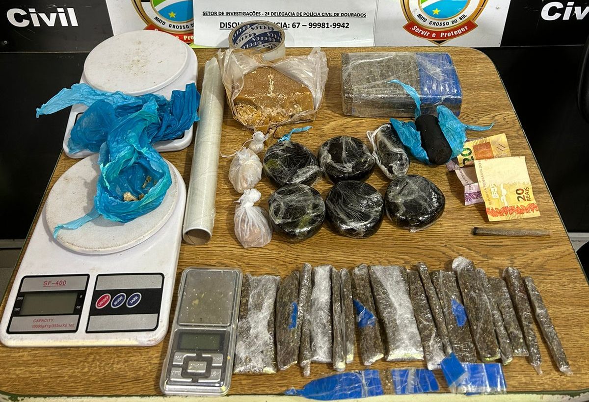 A Polícia Civil, por intermédio da 2ª Delegacia de Polícia de Dourados, em decorrência de investigação para apurar crime de Tráfico de Drogas, prendeu em flagrante um casal, mantendo em depósito, em sua residência, cerca de 700g de maconha, 500g de pasta base e 600g de haxixe.