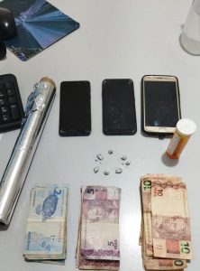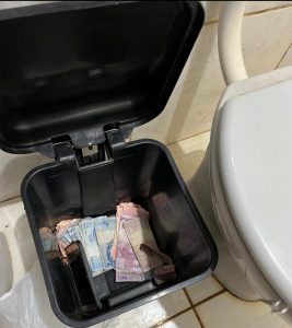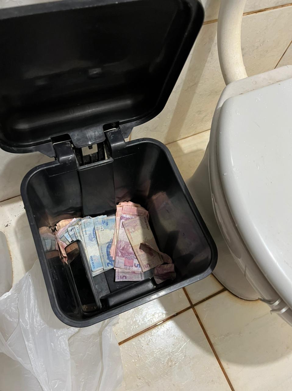 A mulher informou aos policiais que seu convivente, o adolescente C.A.A.S. estaria no banheiro, sendo ouvido um barulho de descarga. Após a saída do adolescente do banheiro, os investigadores questionaram para os dois se havia droga na residência e eles negaram, porém, ao vistoriar o referido cômodo, foi localizado dentro do cesto de lixo várias cédulas de dinheiro em valores de R$ 2,00, R$ 5,00 e R$ 10,00, característicos de venda de entorpecentes que após contagem totalizaram R$ 299,00.