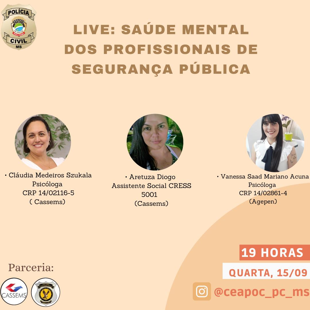 Campo Grande (MS): A Polícia Civil, por meio da Coordenadoria de Atendimento Psicossocial da Polícia Civil/Ceapoc, convida os servidores para a live “Saúde Mental dos Profissionais de Segurança Pública”. A palestra virtual contará com a presença da psicóloga Cláudia da Cassems (CIAPS), da assistente social Aretuza – Cassems (CIAPS) e da PSICÓLOGA Vanessa – Agepen (Setor de Assistência ao Servidor).