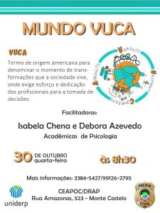 Campo Grande (MS) – A Polícia Civil, por meio da Coordenadoria de Atendimento Psicossocial (Ceapoc), promove nesta quarta-feira (30), o workshop Mundo Vuca que fala sobre mudanças e ensina os servidores da instituição a lidar com os novos tempos.