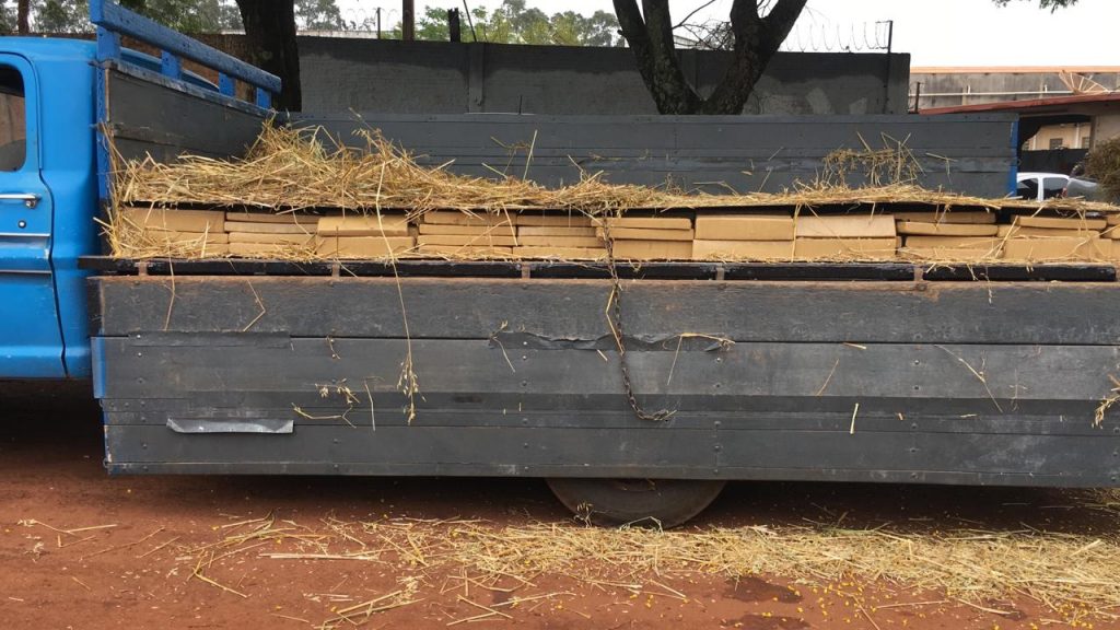 Os policiais realizavam bloqueio policial, quando foi dada ordem de parada para o condutor do caminhão Ford F4000, de cor azul, placa de Ponta Porã-MS e carregado com feno, que era conduzida por um homem, de 39 anos, morador de Belo Horizonte/MG. O suspeito forneceu informações desencontradas e, a partir disso, foi realizada vistoria na carga do caminhão. Foram encontrados diversos tabletes de maconha escondidas no assoalho da carroceria, que após serem pesados totalizaram 1.194kg e ainda outros 06 kg de skunk.