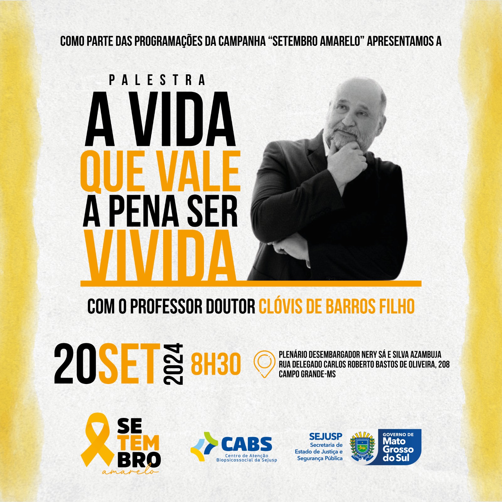Em meio à campanha do Setembro Amarelo, que visa à valorização da vida e à promoção da saúde mental, o renomado jornalista e filósofo Clóvis de Barros Filho ministrará, no próximo dia 20 de setembro, às 8h30, a palestra “A Vida que Vale a Pena Ser Vivida” para os servidores da segurança pública. O evento será realizado no plenário Desembargador Nery de Sá Azambuja, do Tribunal Regional do Trabalho (TRT), localizado no Parque dos Poderes, em Campo Grande.