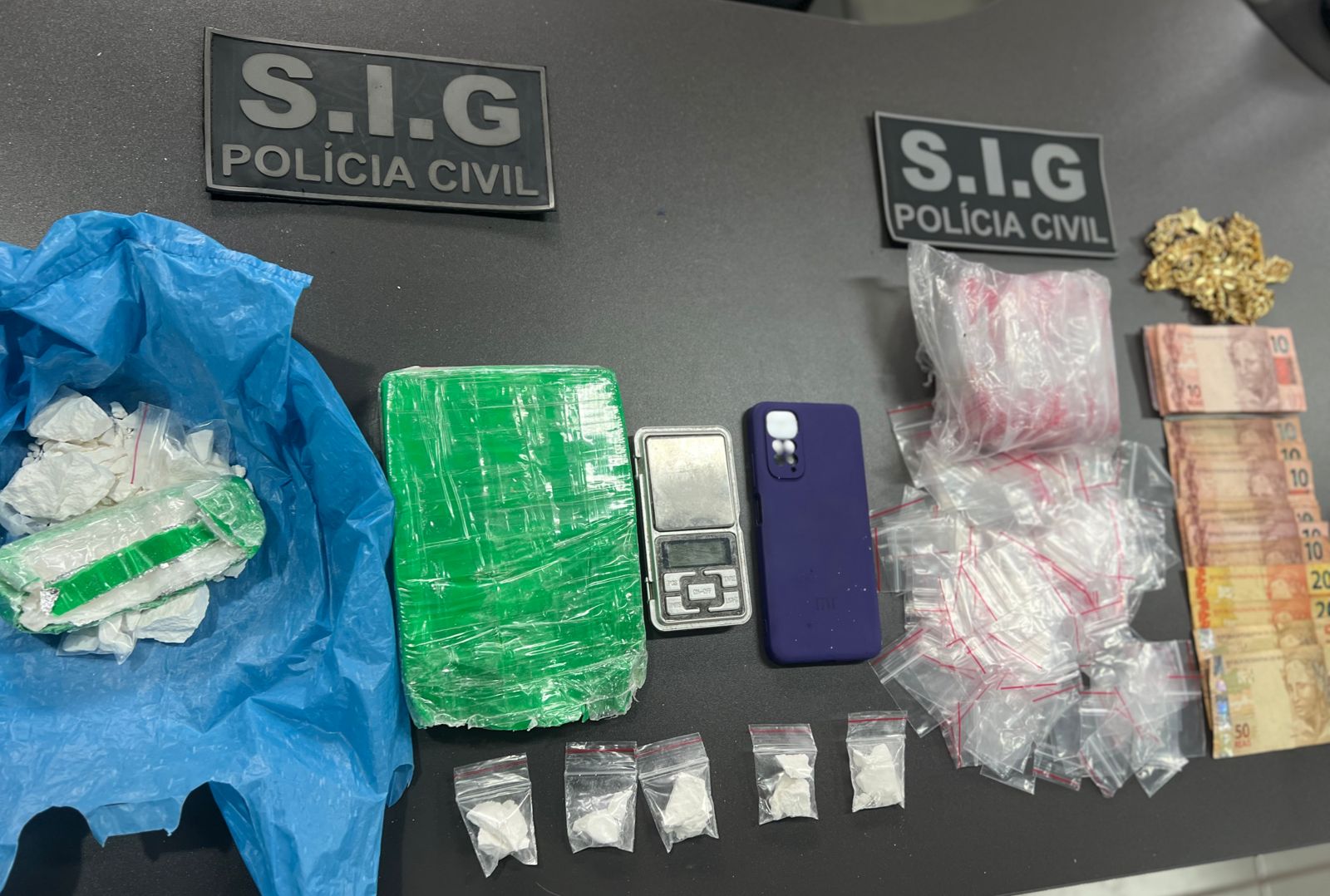 Diante disso, foi feito um monitoramento no local e os investigadores surpreenderam a autora no exato momento em que ela separava a droga em porções menores. No total foram apreendidas 835g de cocaína, além de uma balança de precisão, faca com resquícios do entorpecente, vários sacos para acondicionamento da droga, dinheiro, dentre outros apetrechos.