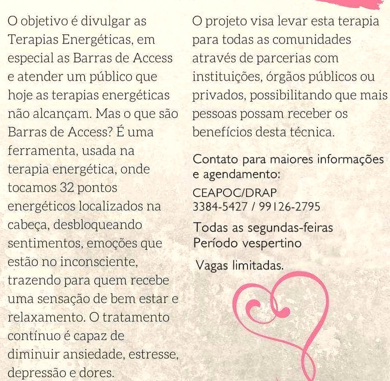 De acordo com as informações, o projeto visa levar esta terapia para todas as comunidades através de parecerias com instituições, órgãos públicos ou privados, possibilitando que mais pessoas possam receber os benefícios desta técnica.