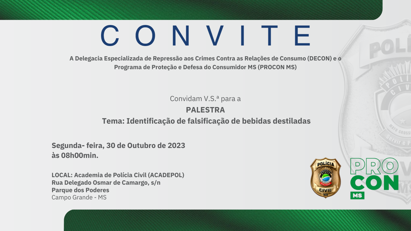 É com grande satisfação que a Delegacia Especializada de Repressão aos Crimes Contra as Relações de Consumo (DECON) e o Programa de Proteção e Defesa do Consumidor MS (PROCON MS) convidam todos os policiais civis para uma palestra: