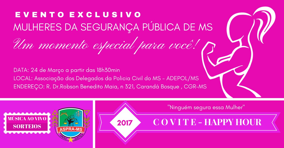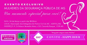 Nesta sexta-feira (24) será realizado um happy hour comemorativo para as mulheres da Segurança Pública, filiadas ou não à quaisquer das entidades que compõem a organização do evento. Para as filiadas o evento será pago pelas respectivas entidades. Para aquelas que não são, o custo é de R$ 40,00. o evento terá música, bebidas, coquetel, atrações e sorteios.