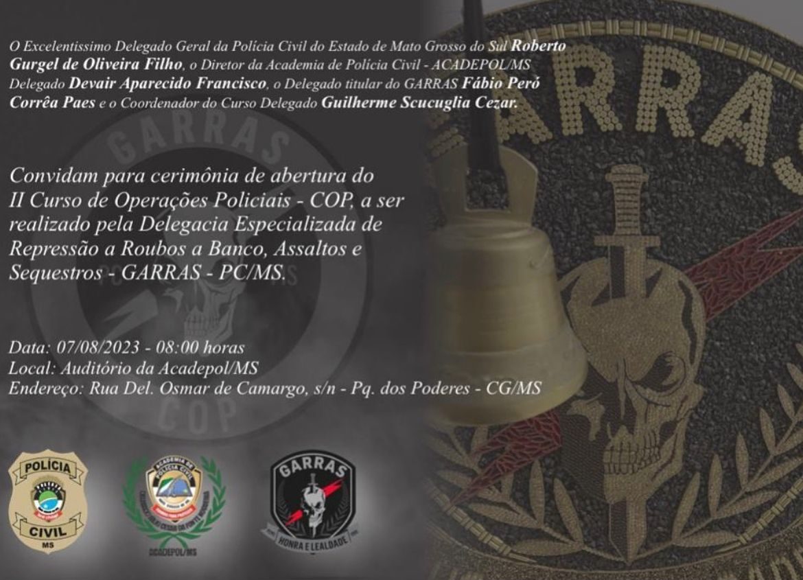 Conforme constante em edital de abertura, os dois primeiros colocados do curso pertencentes aos quadros da Polícia Civil de Mato Grosso do Sul irão compor as equipes do GARRAS.