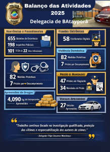 A Delegacia de Polícia Civil de Batayporã apresentou, nesta sexta-feira (19), o balanço institucional das atividades desenvolvidas ao longo de 2025. Os dados consolidam atendimentos, procedimentos instaurados e concluídos, prisões, medidas judiciais e apreensões realizadas no período.
