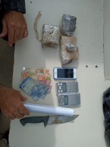 No bairro Vila Haro, um jovem de 24 anos, foi autuado em flagrante por crime de tráfico de entorpecentes, com quem foi apreendida a quantia de 888,00 gramas de maconha, além de uma balança de precisão, R$131 em moeda corrente, entre outros.