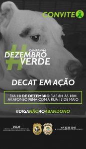 Atualmente, considerando que os meses de novembro a fevereiro os índices de abandono/maus tratos de animais aumentam consideravelmente por conta do período de férias, onde muitas famílias viajam e abandonam seus animais nas ruas ou em estradas vicinais, neste mês de dezembro a Delegacia lançou a campanha Dezembro Verde onde além de divulgar nas redes sociais convocando e conscientizando a população, também estará na próxima quinta-feira (10), das 8h às 10h, na Avenida Afonso Pena esquina com a Rua 13 de Maio onde serão entregues calendários alusivos à Campanha, além de chaveiros. Para as crianças, serão entregues balões verdes, visando despertar o amor e o cuidado com os animais.