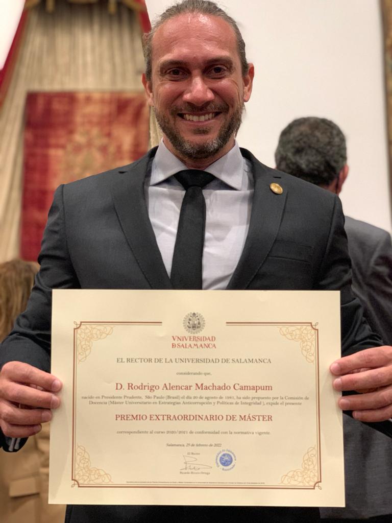 O delegado Rodrigo Alencar Machado Camapum recebeu no dia último dia 03, uma homenagem da Universidade de Salamanca, na Espanha, pela dissertação de mestrado que desenvolveu sob o título: “Estrategia transdisciplinar para el fomento de una cultura de rechazo a la corrupción”, bem como pelo desempenho total no curso.