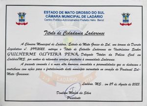 A Câmara Municipal de Ladário, na sessão legislativa desta terça-feira, 29/08, concedeu o Título de Cidadania Ladarense ao Delegado Guilherme Oliveira Pena pelos serviços prestados à sociedade desde o período que assumiu a titularidade da Delegacia de Polícia Civil de Ladário. A Câmara aprovou ainda uma moção de congratulação agraciando o delegado.