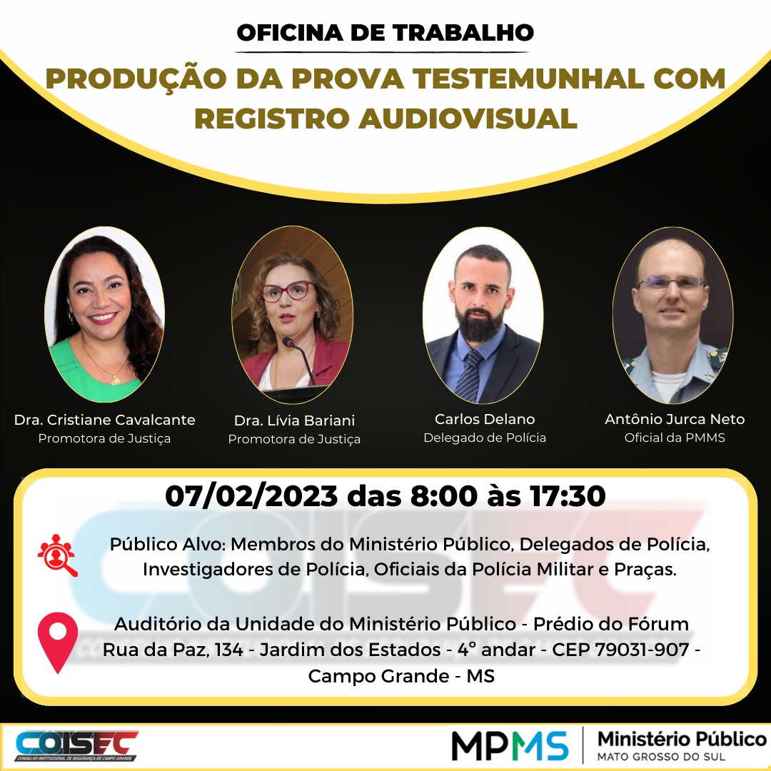 O evento é uma realização do Conselho Institucional de Segurança Pública, com apoio do Ministério Público de Mato Grosso do Sul. Os Palestrantes serão Dra. Cristiane Cavalcante – Promotora de Justiça, Dra. Lívia Bariani – Promotora de Justiça, Dr. Carlos Delano – Delegado de Polícia Civil e Oficial da PMMS – Antônio Jurca Neto.