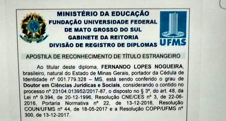 CAMPO GRANDE (MS) – O Delegado da Polícia Civil, e Ouvidor Geral da Universidade Federal de Mato Grosso do Sul (UFMS), Drº Fenando Lopes Nogueira, recebeu hoje (22) o título de Doutor em Ciências Jurídicas e Sociais, publicado pelo Ministério da Educação (MEC).
