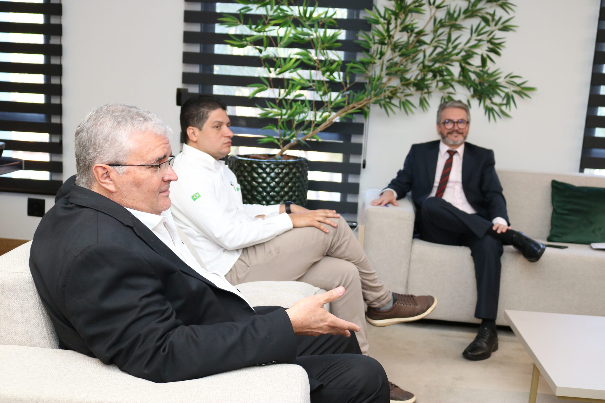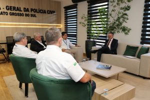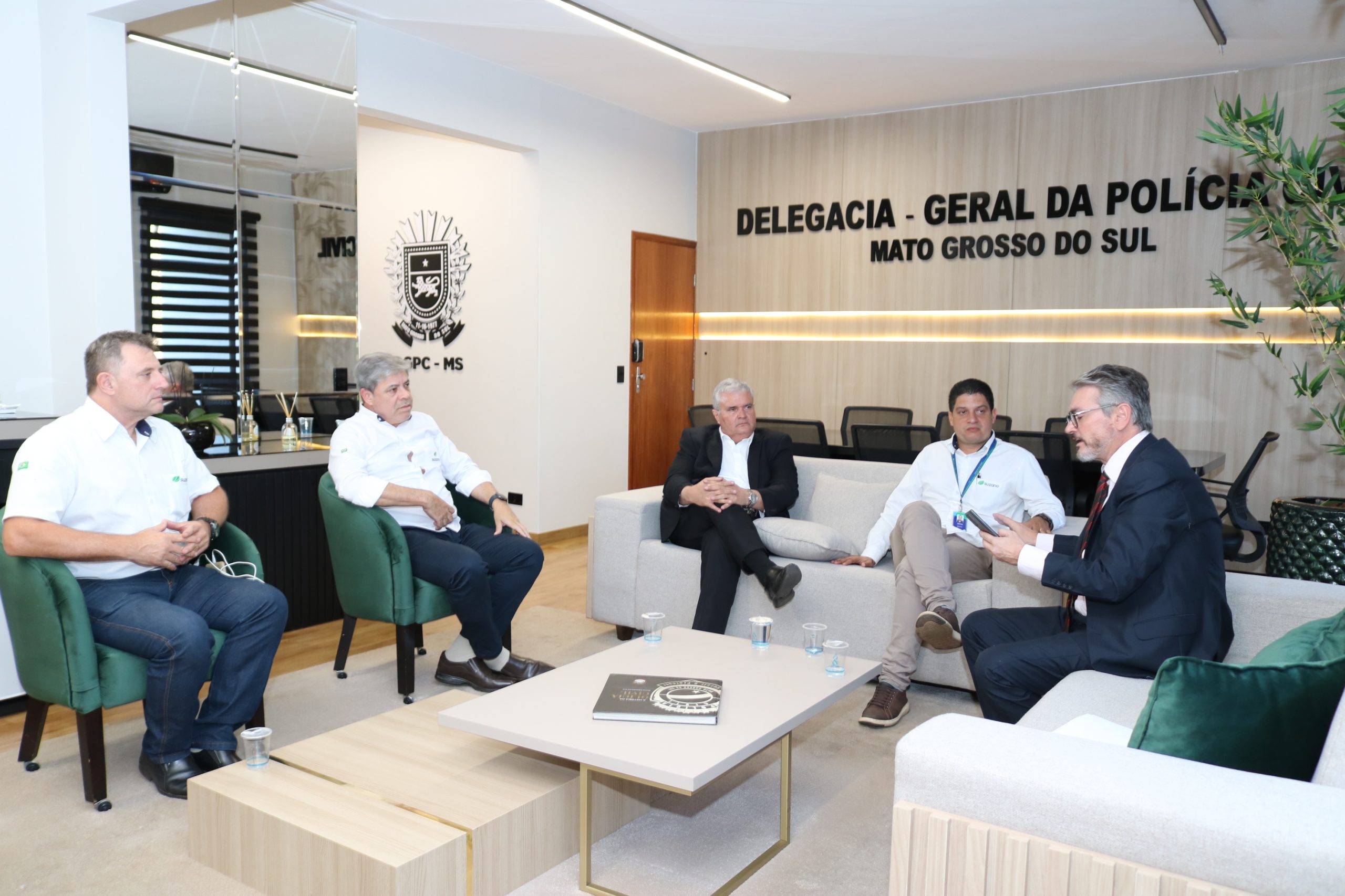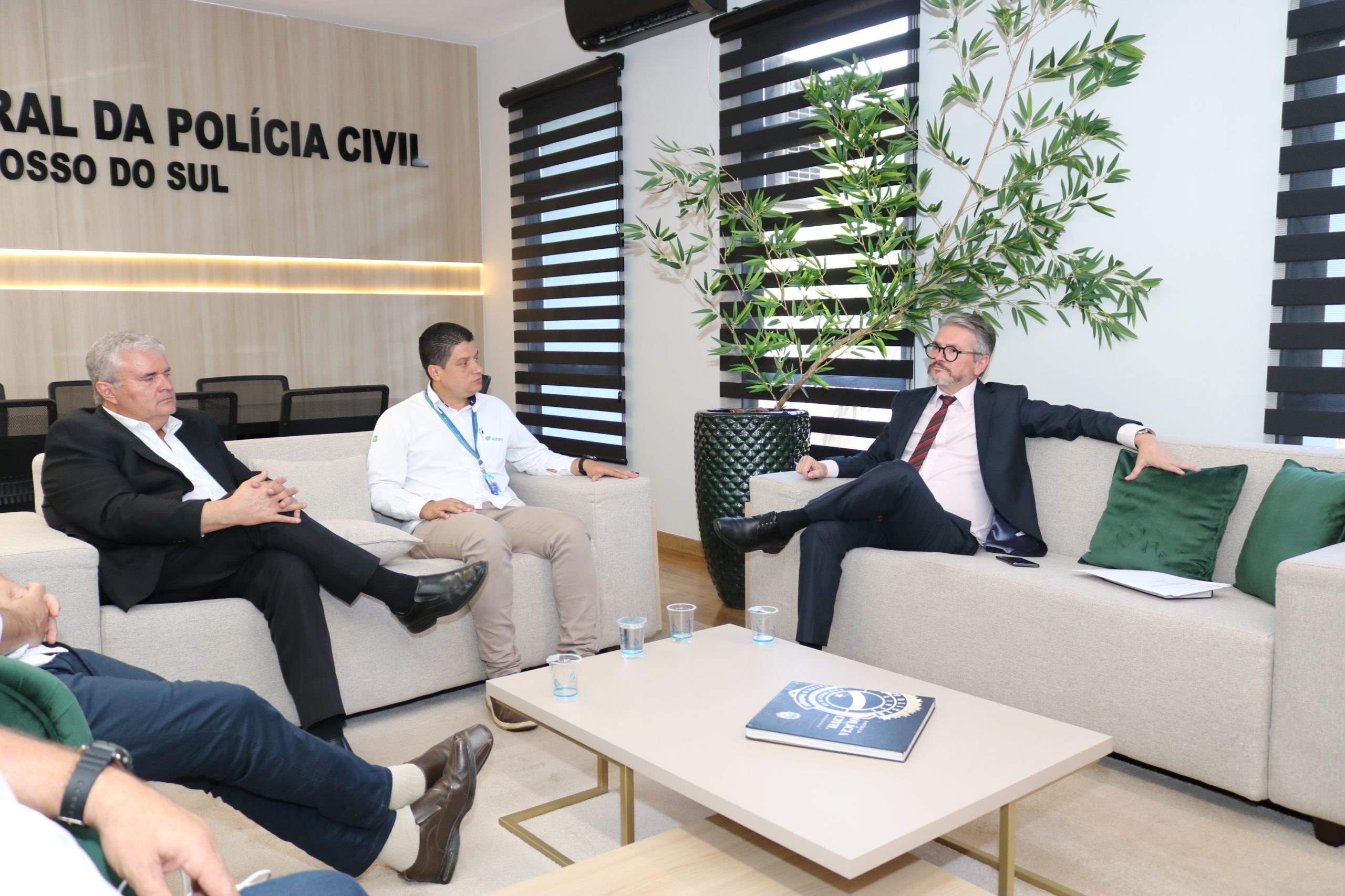 Nesta quarta-feira (14), o Delegado-Geral da Polícia Civil de Mato Grosso do Sul, Lupérsio Degerone Lucio, e o Diretor do Departamento de Polícia do Interior (DPI), Jairo Mendes, receberam na Delegacia-Geral da PCMS membros da gerência de inteligência patrimonial florestal da empresa Suzano. A reunião institucional e de cortesia contou com a presença de Marcelino Mai, Amarildo Nunes e Hausney Silva, representantes da Suzano.