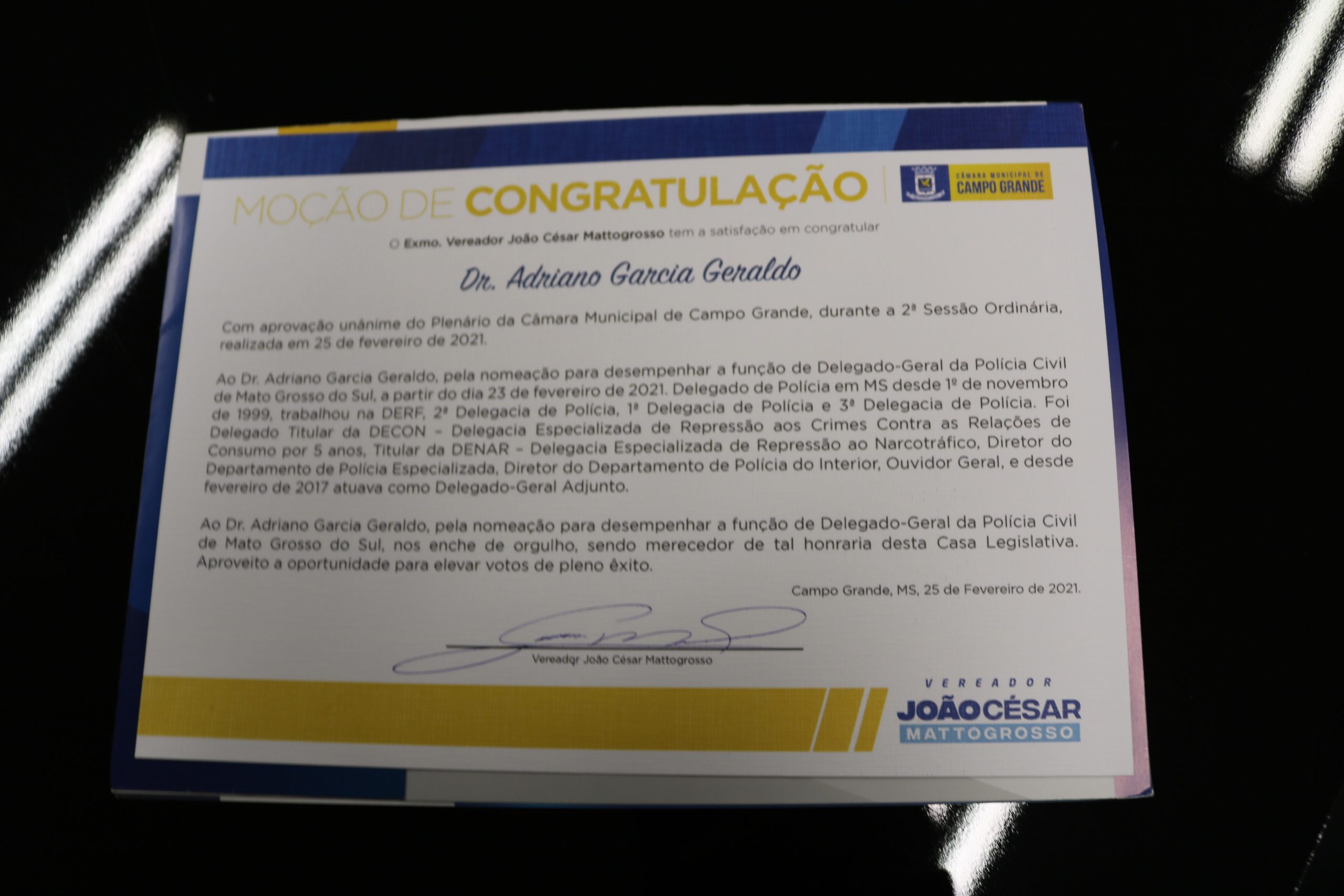 Campo Grande (MS): O Delegado Geral da Polícia Civil – Adriano Garcia Geraldo – recebeu na manhã desta quarta-feira (17) uma moção de congratulação, do vereador João César Matogrosso, pela nomeação ao cargo de Delegado-Geral da Polícia Civil.