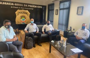 O Delegado Geral da Polícia Civil, Marcelo Vargas, e o Diretor de Departamento da Capital, Fabiano Nagata, receberam, nesta terça-feira (26), o gerente comercial, Vitor Gallo, e o representante comercial, Adriano Reis, ambos da empresa Protecta, que realizou a blindagem das novas viaturas e presenteou, hoje, o Delegado Geral com um novo modelo de colete balístico.