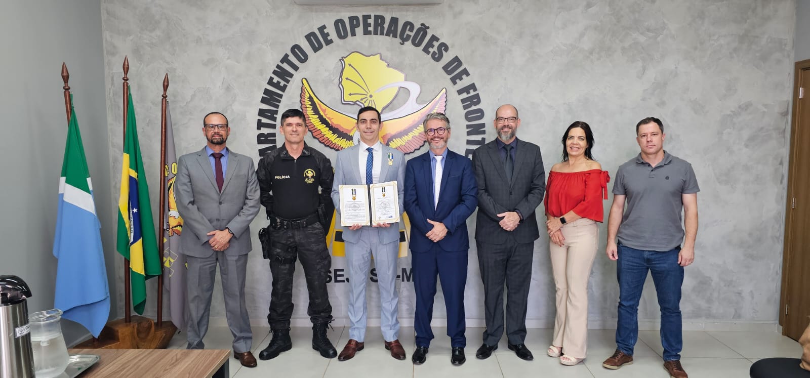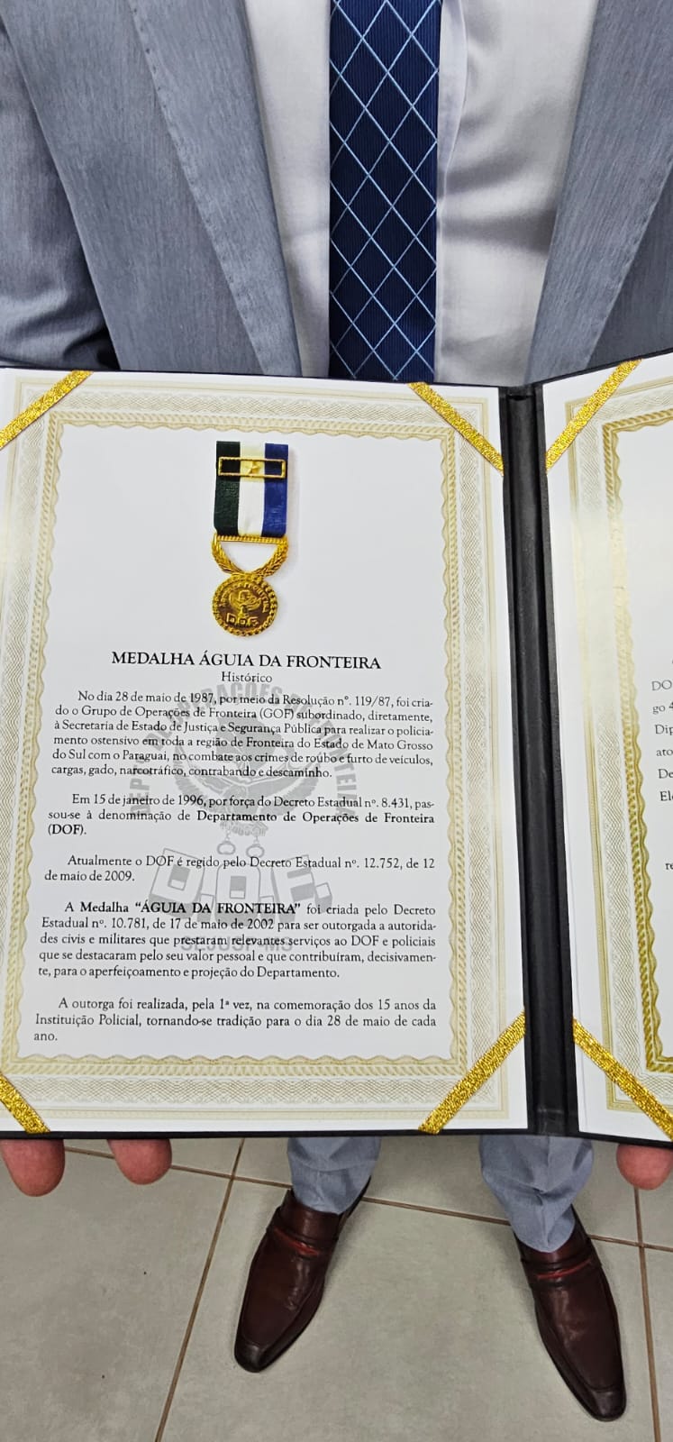 O Delegado-Geral, Dr. Roberto Gurgel de Oliveira Filho, foi agraciado com a Medalha Águia da Fronteira, uma condecoração que reconhece os serviços de destaque prestados à segurança e à eficiência das operações realizadas pelo Departamento de Operações de Fronteira (DOF).