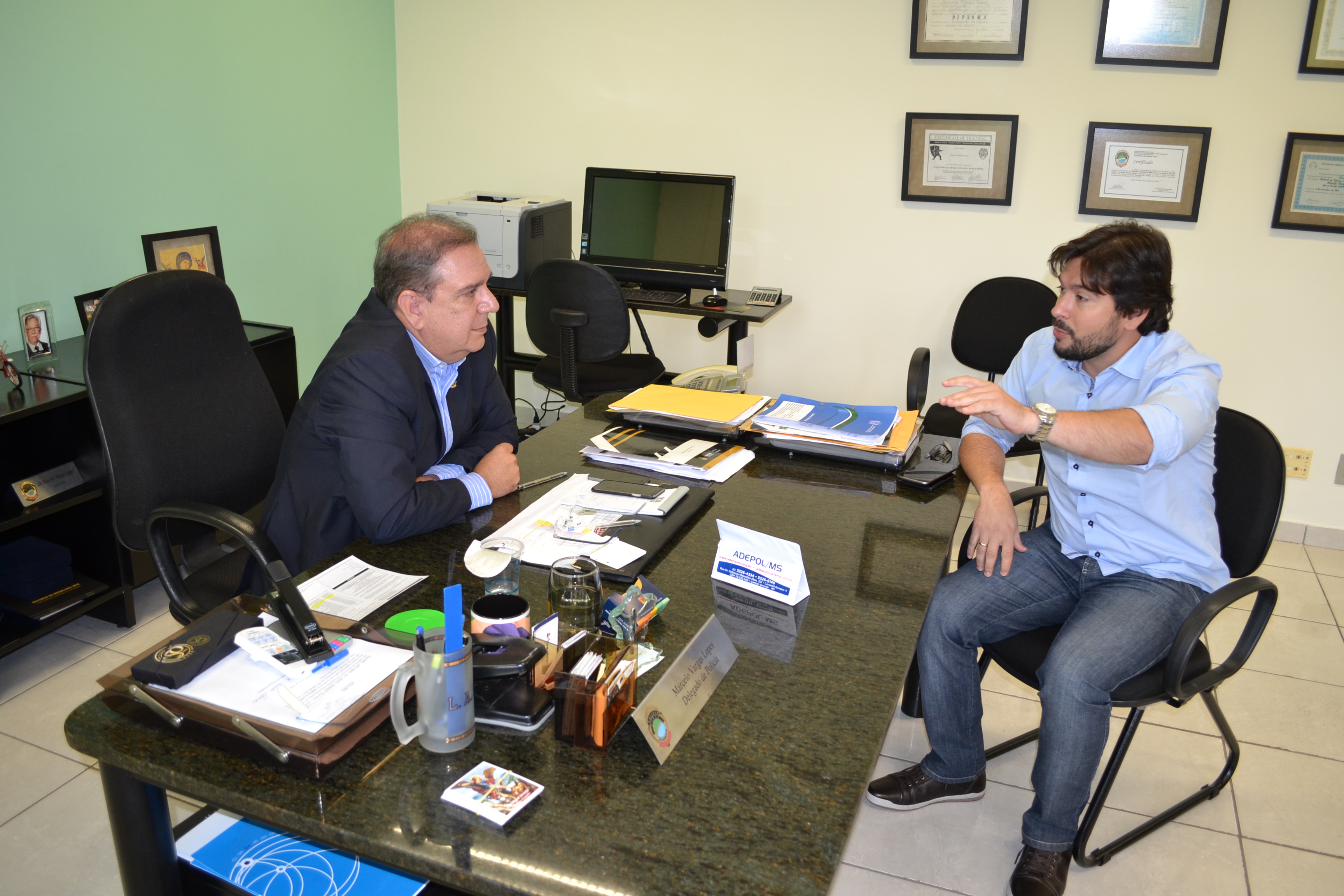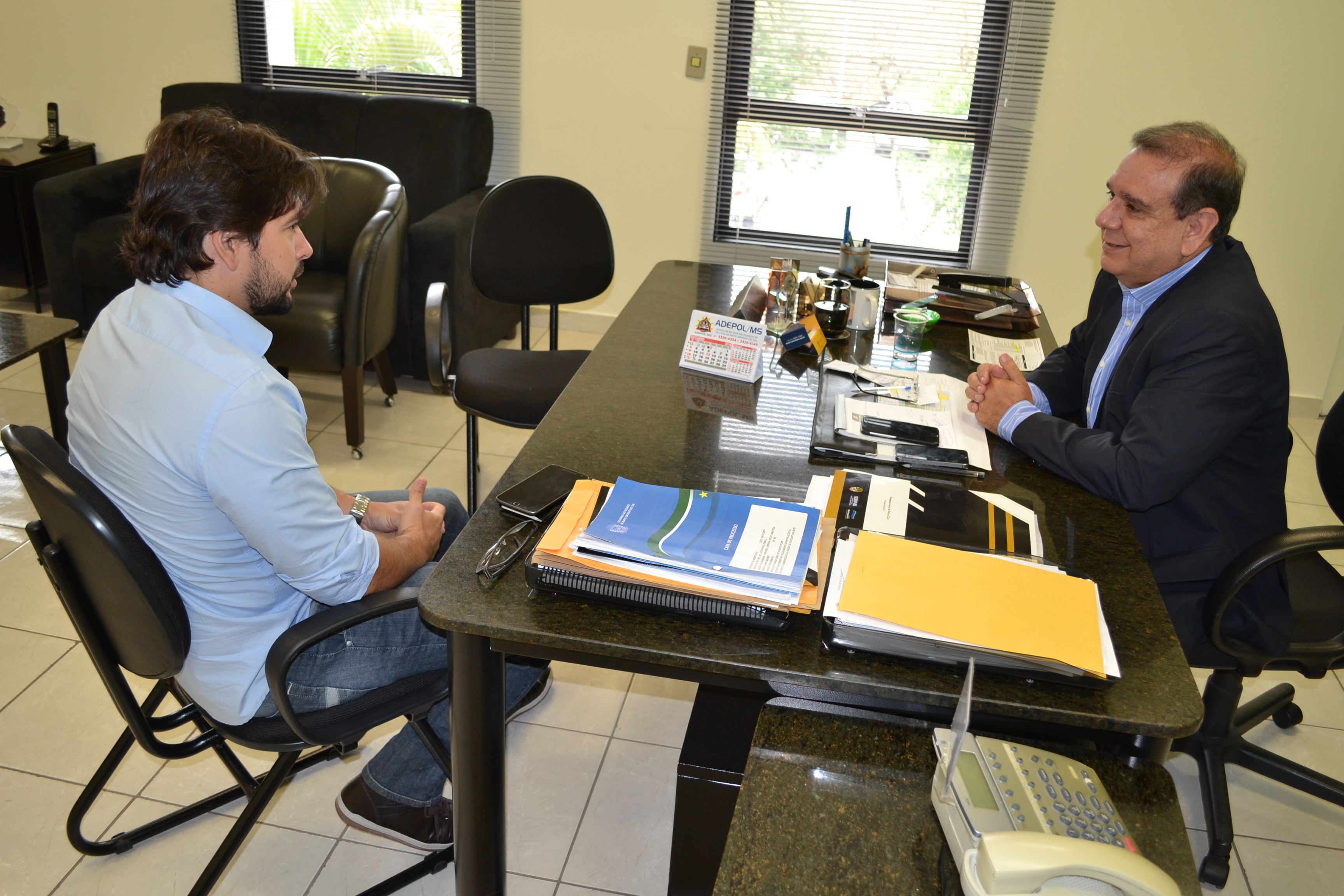 CAMPO GRANDE (MS): O Delegado Geral da Polícia Civil do Mato Grosso do Sul – Dr. Marcelo Vargas Lopes recebeu, nesta terça-feira (18), o presidente do SINPOL-MS (Sindicato dos Policiais Civis do Mato Grosso do Sul) – Giancarlo Miranda, em visita institucional onde foi debatida as alterações da Lei Complementar nº 114/05, que dispõe sobre a organização institucional da PCMS e as carreiras, direitos e obrigações de seus membros.