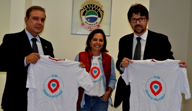 CAMPO GRANDE (MS): O Delegado Geral da Polícia Civil do Mato Grosso do Sul – Dr. Marcelo Vargas Lopes recebeu em seu gabinete, na tarde desta quarta-feira (26), o Delegado Cleverson Alves dos Santos e a representante do projeto Caçadores de Bons Exemplos, Márcia Belo. No Mato Grosso do Sul, 17 projetos receberam o prêmio criado para dar destaque a boas ações e Dr. Cleverson – idealizador do projeto – foi homenageado pelo ‘Costa Rica Sem Drogas’.