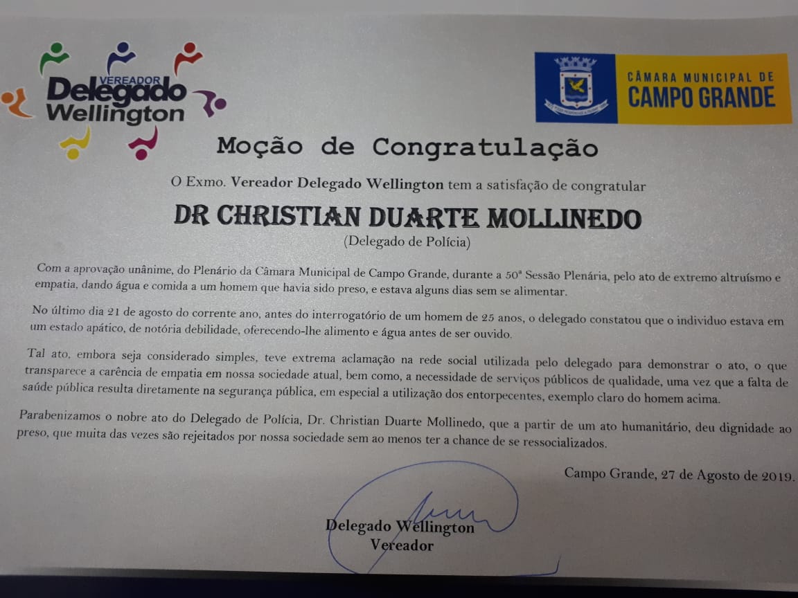 Campo Grande (MS): A Câmara Municipal de Campo Grande aprovou por unanimidade, uma Moção de Congratulação ao delegado da Polícia Civil Christian Duarte Mollinedo, durante a 50ª Sessão Plenária desta terça-feira (27). A homenagem se deve ao “ato de extremo altruísmo e empatia, dando água e comida a um homem que havia sido preso, e estava alguns dias sem se alimentar”.