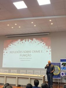 Em sequência, o delegado Lucio Marinho, responsável pelo Núcleo Regional de Inteligência (NRI) de Bataguassu, abordou a evolução da força policial e o papel da tecnologia no combate ao crime, explicando sobre as novas modalidades de crimes cibernéticos e sobre técnicas de cyberinvestigação. Por fim, o delegado Daniel Wollz apresentou o tema “Reflexões sobre crime e punição”, estimulando a reflexão dos acadêmicos sobre o sistema penal, questionando a eficácia do modelo atual na prevenção e repressão da criminalidade.
