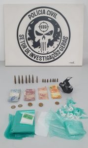 Em buscas pelo local, foram encontradas 30 porções de substância análoga à cocaína, embaladas prontas para a venda, munições de arma de fogo, de calibre 5,56, calibre 9mm e calibre 7,62, bem como a quantia de R$ 52,75 sem comprovação lícita. Na cozinha da residência também foi encontrada uma porção maior de cocaína, pesando aproximadamente 9 gramas.