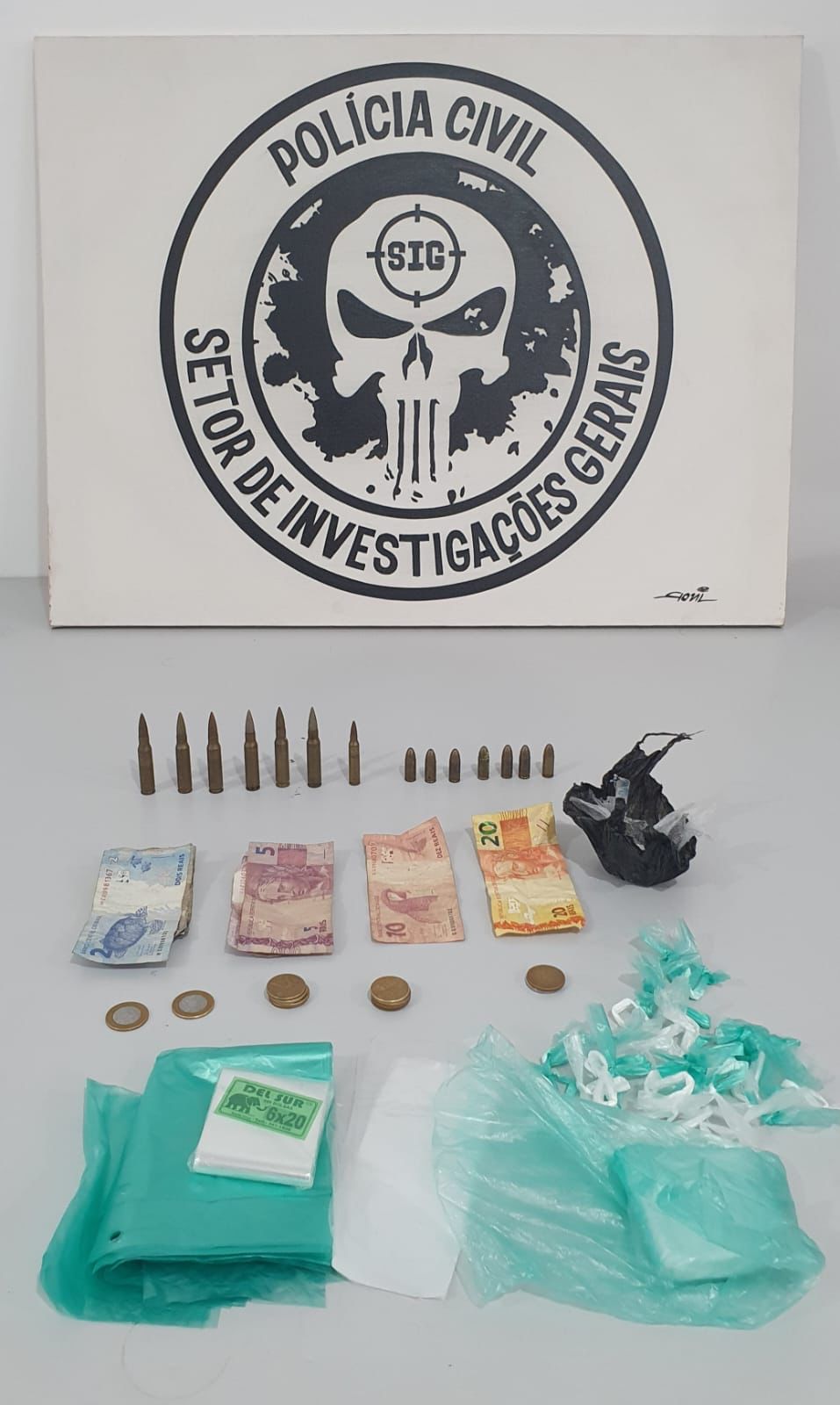 O autor foi autuado em flagrante pelo delito de tráfico de drogas e por possuir munição de arma de fogo de uso restrito sem autorização e em desacordo com determinação legal ou regulamentar.