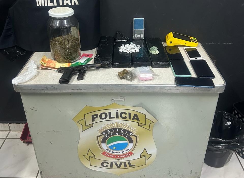 No interior do imóvel também foram apreendidos mais uma porção de cocaína, pesando 20,6 gramas, 2.555 gramas de maconha, uma pistola marca FN, calibre .765, balança eletrônica de precisão, uma maquininha de cartão de crédito, diversos embalagens plásticas, dois aparelhos celulares e R$48,00 em notas de baixo valor, razão pela qual L.G.A. (25) e K.D.S. (27) foram autuados em flagrante delito por tráfico de drogas de posse de arma de fogo.