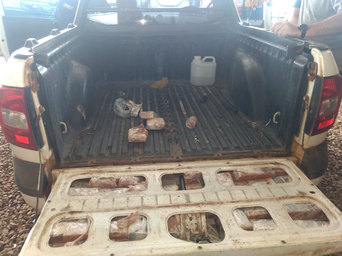 A droga estava escondida nas latarias, bancos e assoalho da carroceria de uma VW/Saveiro, com placas de Fortaleza, conduzida por L. V. C. de 25 anos e, como passageiro, R. L. A. de 29 anos.