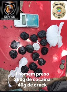 Na de ontem (16), a Polícia Civil, por meio da Delegacia Especializada de Repressão aos Crimes de Fronteira – DEFRON, apreendeu 260g de cocaína e 40g de crack, em posse de adolescente que tentava esconder a droga a mando de homem, que foi preso.