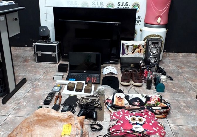 No imóvel também foram encontrados vários objetos provenientes de furto, televisores, notebook, calçados, perfumes, subtraídos de uma residência situada no Jardim Imperial no último domingo, e de um escritório de terraplanagem, situado no distrito industrial, alvo de furto no mês passado.
