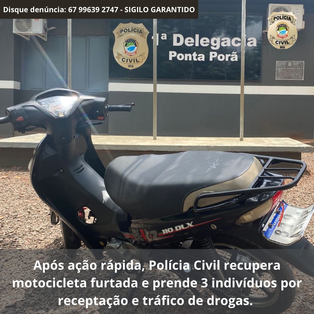 Em Ponta Porã, rápida ação da Polícia Civil resulta na apreensão de moto furtada e na prisão de três indivíduos por tráfico de drogas