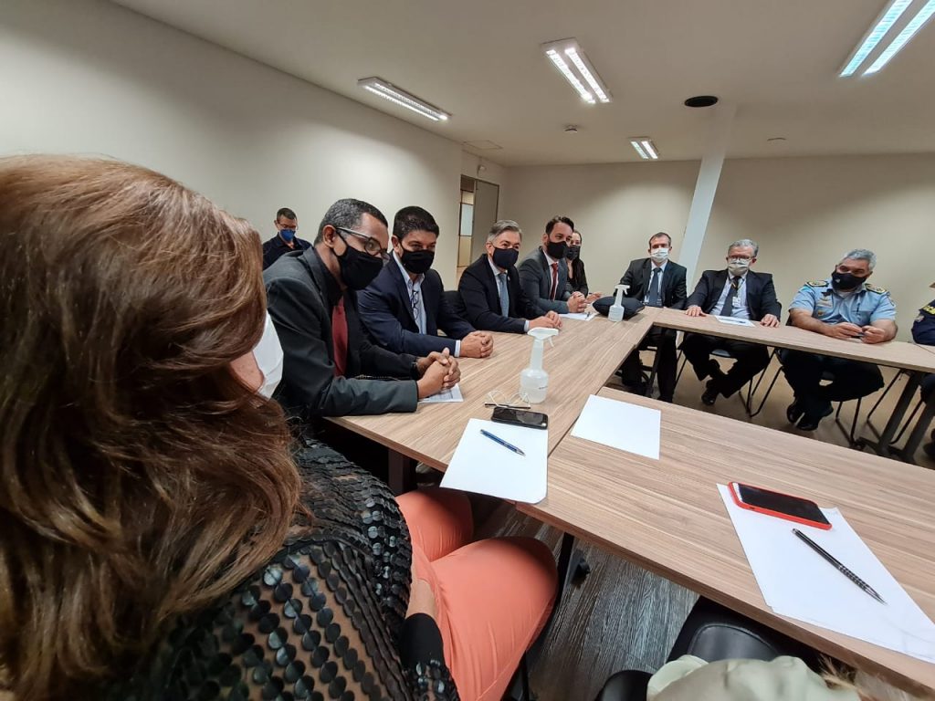 O secretário de Estado de Justiça e Segurança, Antonio Carlos Videira e o adjunto da pasta, coronel Ary Carlos Barbosa, receberam os peritos da Senasp na tarde de ontem (6), para uma reunião que aconteceu no auditório da Sejusp e contou com as presenças dos representantes da Polícia Civil, Polícia Militar, Coordenadoria-Geral de Perícias, Agência Estadual de Administração do Sistema Penitenciário (Agepen) e Polícia Rodoviária Federal.